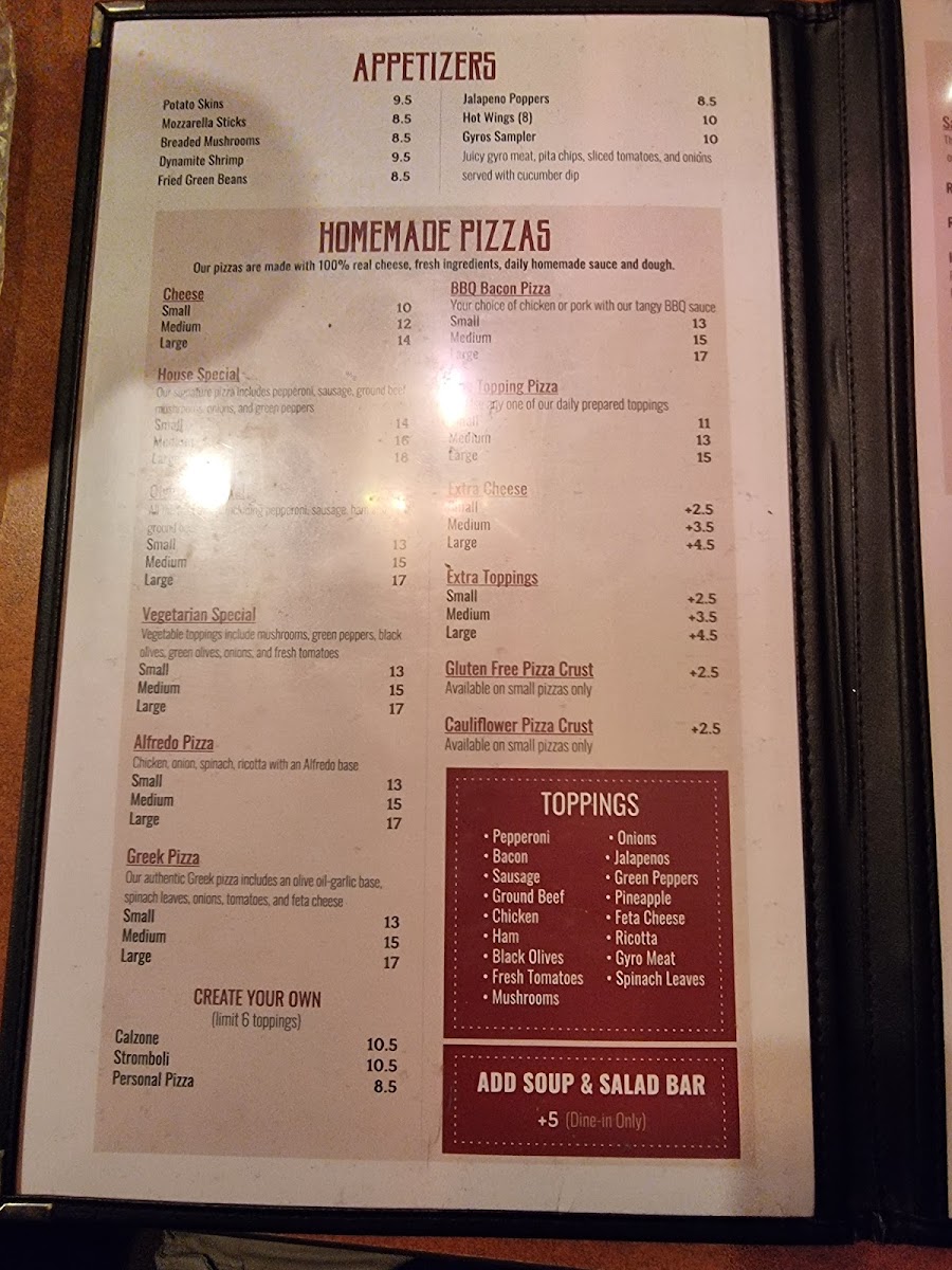 The menu at Olympic Steak & Pizza in Oakland offers a blend of classic American and Italian favorites, suited for relaxed family meals or casual outings with friends. You’ll find a range of comforting dishes that invite you to unwind—whether it’s a hearty steak, a freshly made pizza, or a satisfying salad from the well-stocked salad bar.